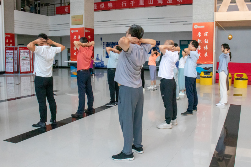 为关心关注教师身心健康,促进全民健身与教师健康深度融合,学院工会主办、教职工文艺协会承办“全民健身进校园 八段锦韵伴我行”——八段锦教学暨教师节送健康活动。活动邀请体育教学部宋清老师担任专家,宋老师首先从“心肺功能、身体力量、柔韧练习”三个方面为老师们详细介绍了健康养生知识,带领老师们做了全面充分的热身活动。随后,他向老师们讲述了八段锦的基本动作与呼吸要领,在柔和缓慢的一招一式间,帮助大家舒展筋骨、调理气血,营造了积极锻炼、乐享健康的良好氛围。