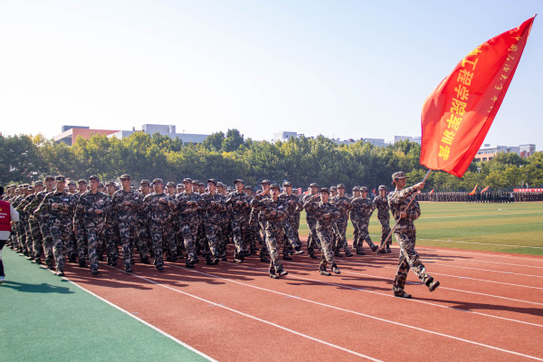 大会在庄严激昂的国歌声中正式拉开帷幕,鲜艳的五星红旗在全体人员的注目礼中冉冉升起,迎风飘扬。随后分列式汇报表演开始,各学院方阵依次正步踏过主席台。同学们身着整齐的军训服,身姿挺拔,步伐铿锵有力,口号声响彻云霄。他们整齐划一的动作、昂扬向上的精神风貌,彰显出经过军训磨砺后所具备的坚毅品质与蓬勃朝气,充分展现了我校 2025 级新生的良好素养,赢得了现场观众阵阵热烈掌声。