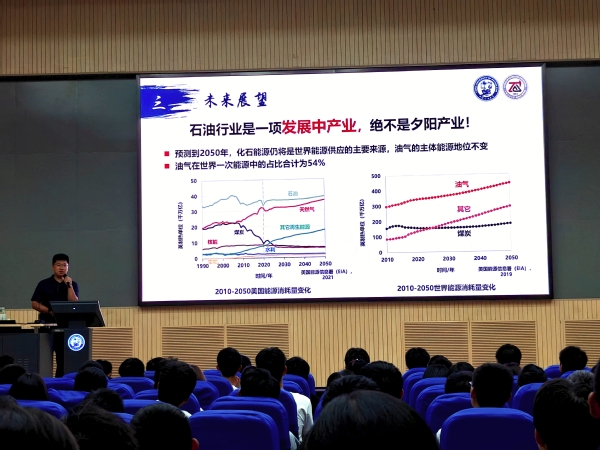 杨琪硕首先代表学院,向全体新生致以最诚挚的欢迎,并概述了学校波澜壮阔的历史进程,从建校初期的筚路蓝缕到如今的蓬勃发展,每一段历程都承载着无数石大人的梦想与奋斗。接着,他又详细介绍了学院的专业特色、学科优势以及雄厚的师资力量,让新生们对即将学习和生活的地方有了更全面、更深入的了解。同时,他也简要介绍了两位辅导员以及学校各个部门的职责与分工,让新生们在遇到问题时能够及时寻求到帮助。在谈及学习这一大学生活的核心主题时,他着重强调,学习是学生的第一要务,是开启未来无限可能的钥匙。在大学这个知识的殿堂里,新生们要从被动接受知识的“填鸭式”学习转变为主动探索知识的“自主式”学习,更要努力发展为具有创新精神的创造性学习,始终保持一颗对世界的好奇心,勇于质疑,敢于突破。此外,他还结合石油行业的最新动态和发展趋势,对石油产业的未来局势进行了深入分析,并展示了2025届本科毕业生就业情况和2025年学校转专业情况等相关数据,为新生们树立了专业自信,指明了学习方向。