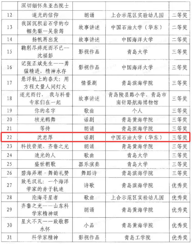 【本站讯】近日,2025年青岛市科学家精神文艺作品征集活动结果揭晓,我校5项作品获奖并获评优秀组织单位,其中由石油工程学院及石油魂辅导员工作室报送的原创话剧《沈忠厚》荣获三等奖。
