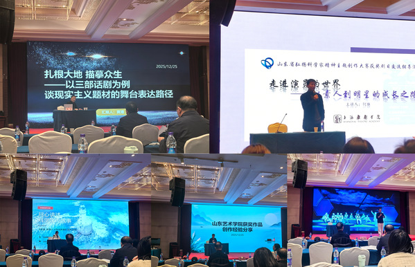 12月25日下午,活动正式拉开帷幕。山东省科协调研宣传部部长侯丽燕出席开幕式并致辞。青岛演艺集团原董事长、国家一级演员、一级导演黄港以《扎根大地 描摹众生——以三部话剧为例谈现实主义题材的舞台表达路径》为题作专题分享,结合经典剧目案例,深入剖析舞台艺术诠释科学家精神核心内涵的有效路径。随后,获奖剧目代表依次分享优秀作品创排展演经验,从题材挖掘、剧本打磨到舞台呈现全流程展开细致讲解。在专家集中答疑环节,王静围绕我校话剧《沈忠厚》创作中的难点问题向专家请教,专家团队逐一给出针对性指导建议,为作品后续提升明确方向。
