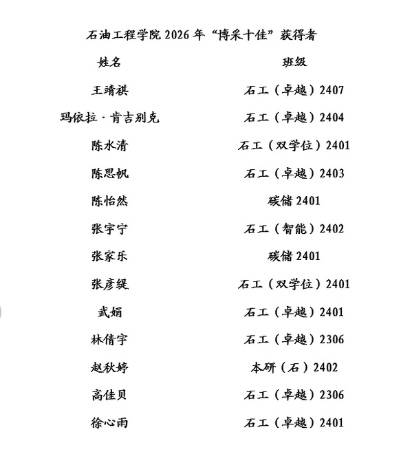 关于石油工程学院2026年“博采十佳”评审结果的公示