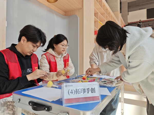 活动现场精心设置“句钉情诗”“破界撕标”“拓印手创”“掌心传暖”“绘语识心”“人人都是天才”六大特色互动摊位,以轻松有趣的形式,引导同学们打破心理桎梏。在“破界撕标”摊位,参与学生撕下刻板标签,宣告自我主张;在“句钉情诗”展区里,三行短诗承载着温柔告白与成长期许,字字真挚、句句暖心;在“拓印手创”摊位上,专属纹样在参与学生指尖定格,每一幅作品都是独一无二的成长印记;“掌心传暖”环节中,参与学生在纸上留下掌印,让善意与力量在掌心流转;“绘语识心”环节中,参与学生默契协作、积极思考,在趣味互动中增进理解、释放压力。“人人都是天才”活动是心理辅导中心专属互动环节。徐铭雪带领参与学生体验“即兴戏剧”心理互动,通过沉浸式体验与引导,帮助学生学会自我鼓励与视角转换,以更从容的心态化解生活中的矛盾与困境。