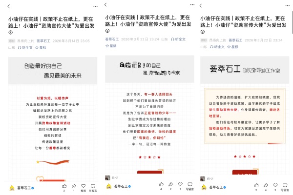 为进一步扩大政策知晓度,宣传大使充分利用线上平台持续推送政策信息,精心制作政策宣讲海报,确保政策宣传覆盖更广、触达更深。活动结束后,宣传大使认真总结实践经验,通过校内外媒体广泛传播资助政策的好声音,产生了良好的社会反响。