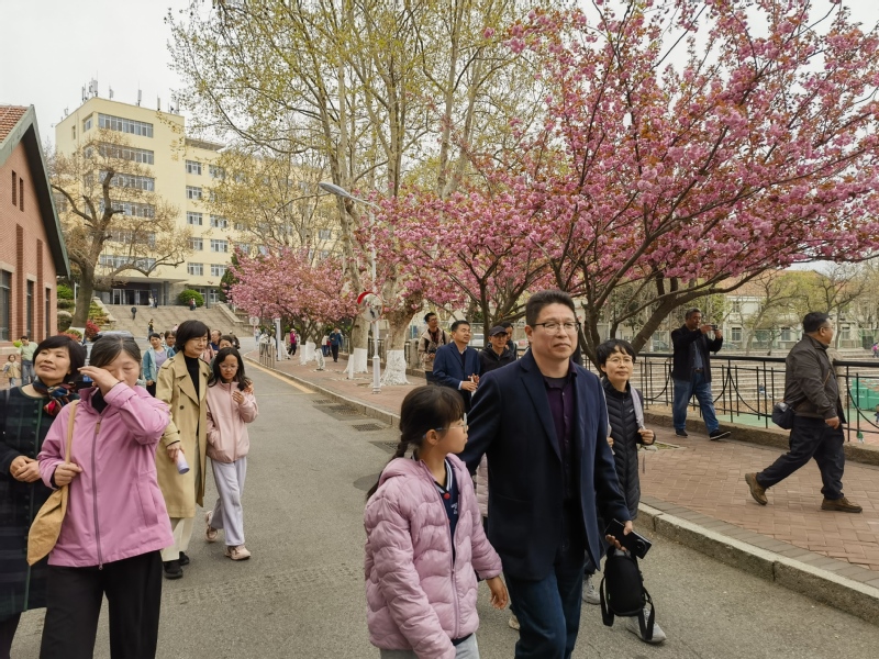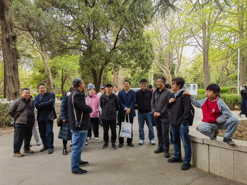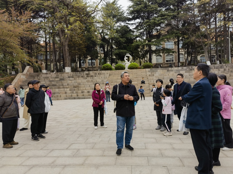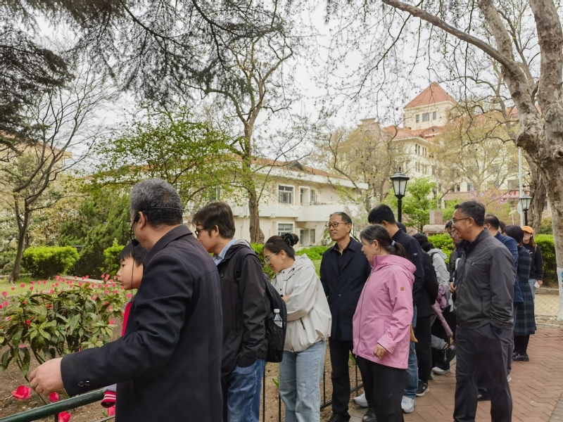 在中国海洋大学鱼山校区,大家一起探访闻一多先生旧居一多楼。1931-1932年间,时任国立青岛大学文学院院长的闻一多曾在此居住。参访团一行实地了解先生学术研究与文学创作的历程。随后,大家一起漫步于鱼山校区六二广场以及科学楼、海洋馆、地质馆、六二楼等建筑物前,一边听取专家讲解,一边欣赏着盛开中的樱花,红瓦绿树与百年德式建筑相映成趣,在山海景致中触摸名校文脉,感受百年高等教育的厚重积淀。